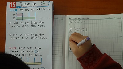 2年生の算数科では、分数や倍の概念の導入部分を学習しています。中高学年や中高生でも繰り返し登場する大切な分野です。しっかり定着できるように復習にも力を入れています。
