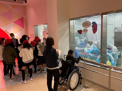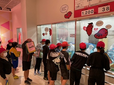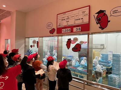 とこなめめんたいパークに着いて、係の人から話を聞いてたり工場見学をさせていただいたりしています。