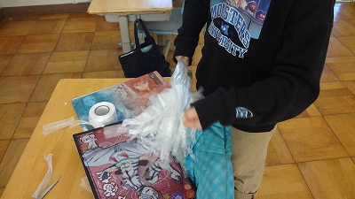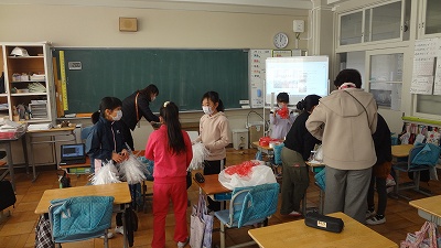 3月1日に予定されている「6年生を送る会」に向けて、各学年が準備をしています。写真は、3年生が踊りに使うボンボンを作っているところです。どのような発表にするか、子どもたち自身がアイディアを出し合いながら、準備を進めています。