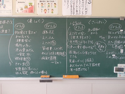 5年生の社会科では、「水産業」の学習を進めていますが、養殖漁業がよいか、それとも栽培漁業がよいのか、あらかじめ各自が調べた根拠をもとに、それぞれのメリット、デメリットを話し合いました。大人でも難しい課題を考え続け、思考力を育む機会になったと思います。せび、ご家庭でも意見交換をしてみてください。