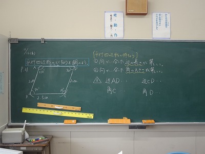今日の算数では、「平行四辺形の特徴」について調べました。見つけた特徴をペアで話し合い、全体で共有しました。ご家庭でも聞いていただけたらと思います。
