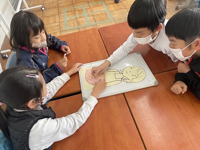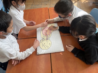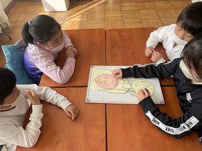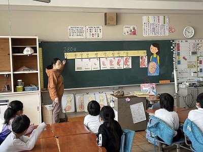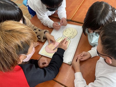 今日は、養護教諭が2年生の教室に出講し、「人のたんじょう」について学習する機会を持ちました。「えーっ!人間って、初めはこんなに小さな点から始まるの!?」「お母さんのお腹の中で少しずつ大きくなって、私たちが生まれたんだね」等、子どもたちは興味津々で、自分が誕生する神秘の世界を垣間見たようでした。 <子ども感想より> ・おなかの中にいるのは、1週間くらいだと思ったけど、280日もあんな大きいおなかをかかえてすごいと思いました。大きいおなかをかかえてりょうりをつくっていてすごいと思いました。お母さんは、わたしがうまれたときホッとしていたことがわかりました。あかちゃんは、はじめのとき小さいのがわかりました。 ・はじめは、おなかにいるのが3か月だと思ったのに、8か月いじょういるなんて、はじめて知りました。赤ちゃんをうむときは、いたかったんだなあと思いました。ママがわたしをうむときは、いたかったのかなぁ、つらかったのかなぁ、どんな気持ちかをまた、ママに聞いてみたいです。わたしがうまれたとき、パパとママは、しあわせだったのかなぁと思いました。 ・お母さんがいっぱい食べたから、元気にそだつことができたよ。ぼくをうむとき、いたかっただろうし、がんばったね。うんでくれてありがとう。早く生まれてほしいな。さいしょのたまごの大きさは、0.1ミリぐらいだったけど、お母さんがいっぱい食べていっぱいえいようがもらえたよ。ありがとう。 ・小さいたまごから、大っきい赤ちゃんになるのを、はじめてしりました。赤ちゃんが280日もおなかの中にいるのをはじめて知りました。お母さんは、ぼくがおなかの中にいたとき、はやくうまれてほしいな~て思っていると思います。 ・最初は、おなかに入っている時間はだいたい3か月くらいだと思っていたけど、「280日もおなかにいたんだよ」と言われたからびっくりしました!あと、お母さんがあんなにくろうして、うんでくれて、うれしくなりました。お母さんは、わたしが出てきたら、ほっとした気持ちだと思います。さいしょは、はりの先ぐらいだつたのに、こんなに大きく育ててくれて今でもうれしいと思いました。(中略)おなかの中にいたのに、ここまで大きく育ててくれてうれしいです。