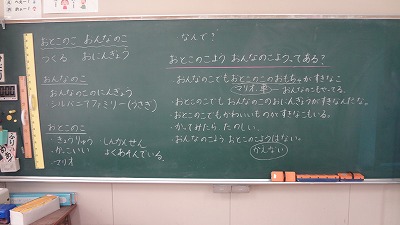 今回の授業を通じて、子どもたちからは、「男の子用、女の子用が決まっていたら、好きなものが買えない。決まっていなければ、好きなものを買える」「男の子用、女の子用はないと思う」等の感想を持ちました。