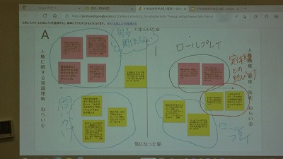 例えば、子どもたちから「男の子でも、女の子のおもちゃが好きな人もいるから、男の子用、女の子用はないと思う」という意見が出ましたが、「‟女の子のもちゃ”が好きな人もいるから・・・ということは、女の子用のおもちゃがある、ということ?」と切り返したり、「男の子用、女の子用はないんだよね?!」→「ない!(子どもたち)」と確認した後、「でも、おもちゃの箱に『男の子用』『女の子用』と書いてあるよ」と画像を提示したりして「これは、どういうこと?」等と、まだまだ世の中にあるジェンダーに対面させて揺さぶる方法などの意見が出ました。