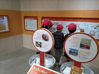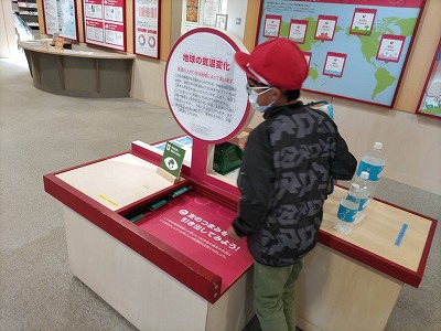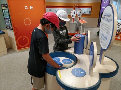 三重県環境学習センターに到着して、展示物を見ています。ここでは、環境問題・環境保全について学習し、自分には何ができるのかについて学びます。