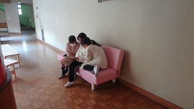 中庭図書館の前を通りかかると、以下の写真のように読書を楽しむ子どもの姿をよく目にします。子どもの姿から、気軽に本を手に取って読める環境づくりの大切さを教えられます。