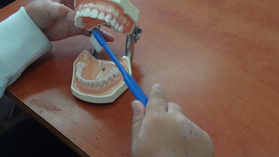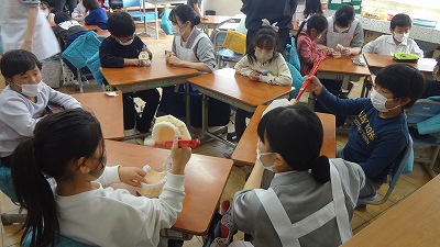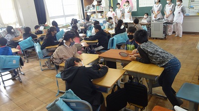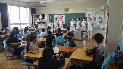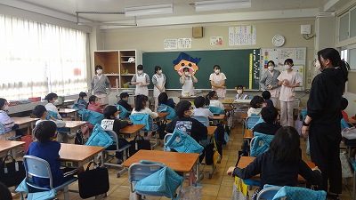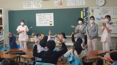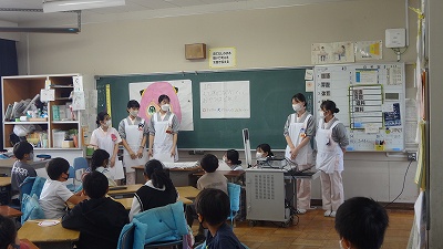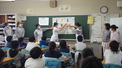 今日は、校区内にあるユマニテク専門学校で歯科衛生士になるための勉強をされている学生の方と先生が来校され、2・4・6年生に出前授業をしていただきました。
