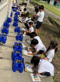 1年生があさがおの観察をしました。「大きくなあれ」って、声をかけてあげるとぐんぐん大きくなるよと話をすると、「大きくなあれ」「大きくなってね」と声をかけていました。