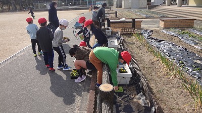 今日は、キッズボランティアに駆けつけてくれた皆さんが、20分休みに花の苗植えと畑の水やりを進んでやってくれました。花は、塩浜商工振興会の皆さんから頂いたものです。キッズ農園がパッと明るくなりました。ボランティアの皆さん、ありがとうございました!