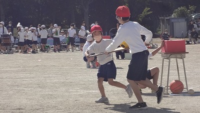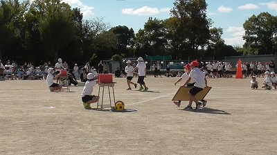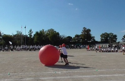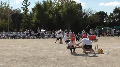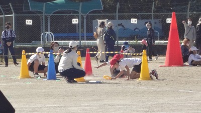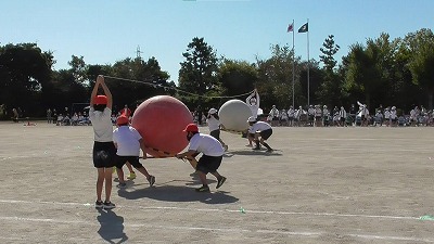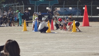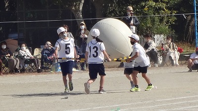 団体競技の様子 ~友達や異学年の子と協力する姿が見られました。ボールを運ぶ協議は、友だちとの調整力が試されました!~