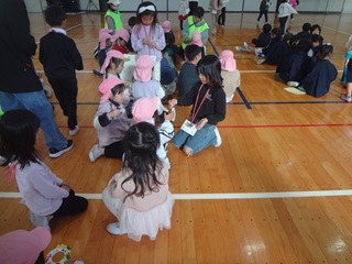 11月28日(金)、磯津保育園、海山道保育園、塩浜こども園から、来年度1年生となる園児に来てもらって交流会を行いました。1年生が園児と手をつなぎながら、「ここが1年生が勉強をしている教室だよ」と校内を案内して回りました。体育館では、ころがしドッジをして一緒に遊び、最後にドングリをきれいに飾ったペンダントをプレゼントしました。1年前の「してもらう立場」から、今度は「してあげる立場」に変わって、1年生がとても頼もしく見えました。園児の皆さんが、喜んでくれているとうれしいです。