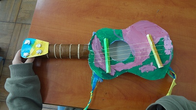 2年生教室の隣にある塩浜ルーム2は、ちょっとした美術館のように作品が展示されています。そこに最近作成した手作り「ギター」が展示されていますが、今日はこの「ギター」を使って「ドレミの歌」の合奏を行いました。
