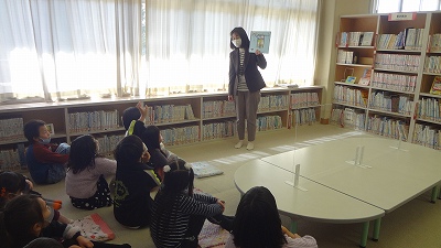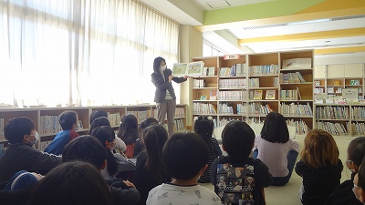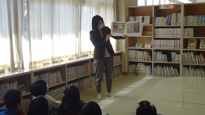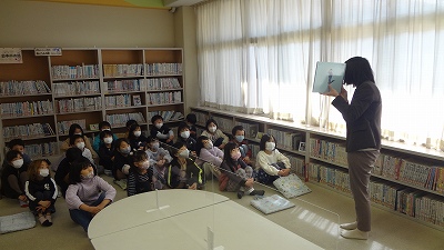 今日は、図書の時間に図書室へ行きました。まず、初めに図書館司書の先生に読み聞かせをしていただきました。