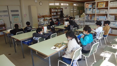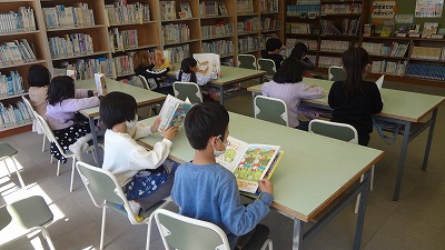 「今日は、時間があるので、2冊読みます」と言われて「やったー!」と喜ぶ子どもたち。その後は、借りたい本を探しました。本を借りると、黙々と