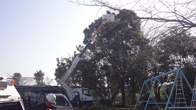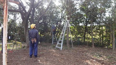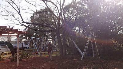 高所作業車をお持ちいただいたり、木登りしていただいたりして、