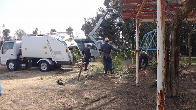 高い木の上の方も剪定していただきました。また、パッカー車もお持ちいただき、選定した枝をたくさん積み込んでくださいました。