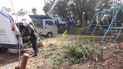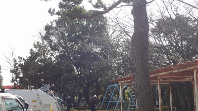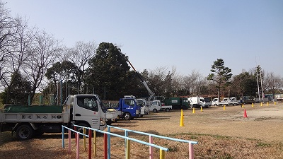 今日は、造園組合の皆さんによる奉仕作業がありました。11業者21名もの方にご来校いただきました。そして、校庭にある「みーつけたの森」の南東部付近の木々の剪定作業をしてくださいました。