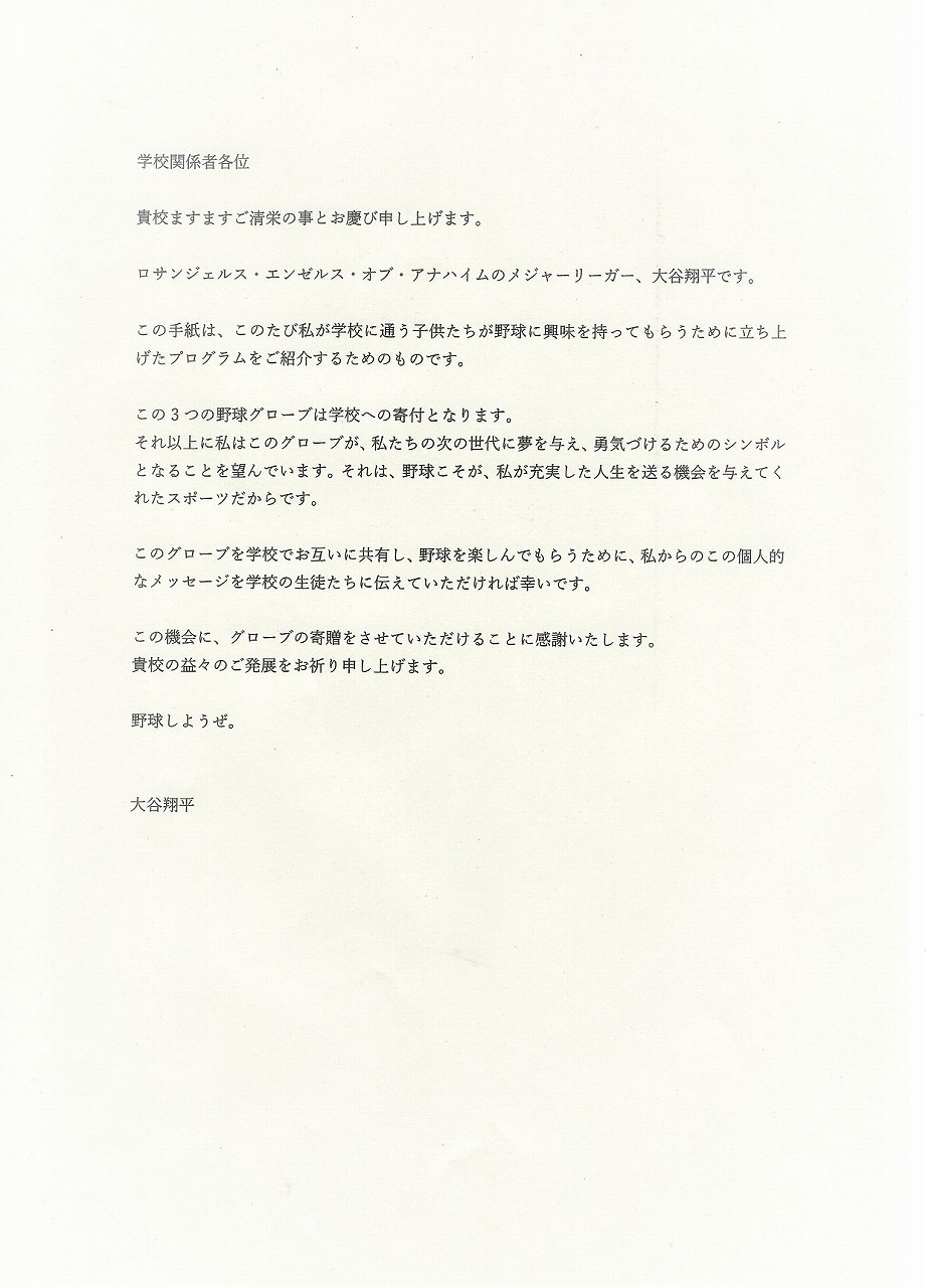 さて、本日、メジャーリーガー大谷翔平選手の寄付としてグローブが本校にも届けられました。グローブは全部で3つ(右利き用・左利き用・小さい子用)です。