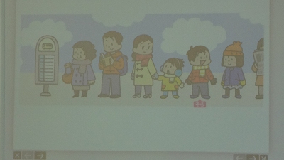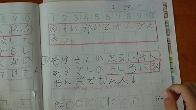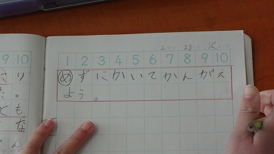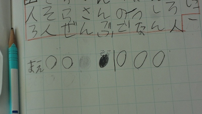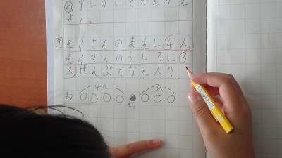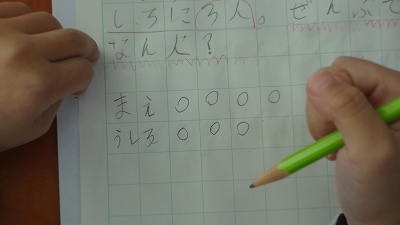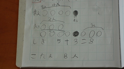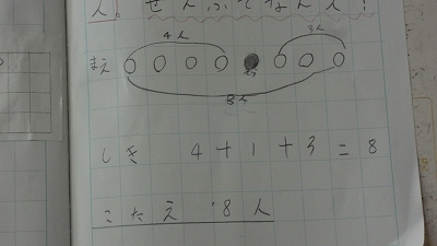 今日の授業では、「図をかいて考える力」を育む授業でした。「バス停で、そらさんの前に4人、後ろに3人並んでいます。みんなで何人ですか?」という問題です。問題文には、「4人」「3人」という情報しかありませんが、問題文を図に表すことで問題を解決していくことができます。問題解決能力のツールを1つ手に入れた子どもたちでした。