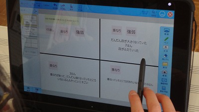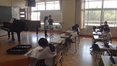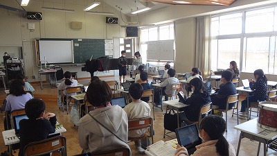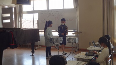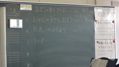 今日の音楽では、「まほうの音を聞き合い、繰り返し、重なり、強弱の工夫の良さを見つけよう」というめあてのもと、イメージに合う音を作り出すことにチャレンジし、音を生みだす楽しみを味わいました。
