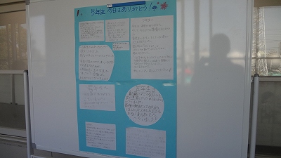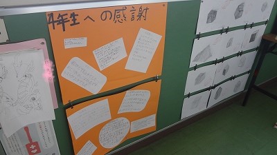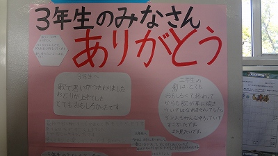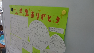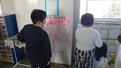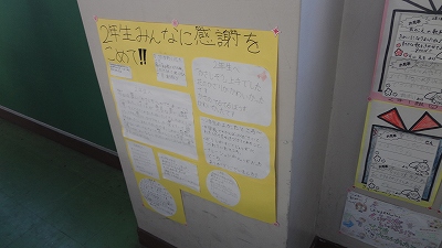 先週の6年生を送る会が終わって、6年生から各学年に「ありがとう」のメッセージが届きました。各学年に掲示されています。