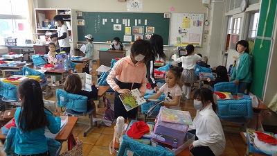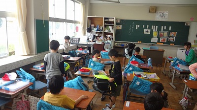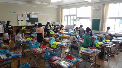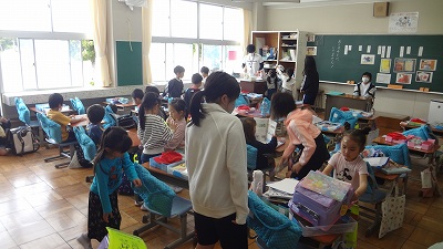 朝、1年生を教室を覗くと、1年生の朝の準備を手伝うために、6年生がたくさん来てくれていました。頼りになる6年生です!