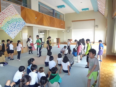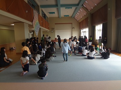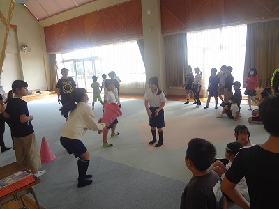 運動会に向けて、学年競技の練習が始まっています。まずは、どのような競技なのかを理解するために多目的ホールで練習をしています。