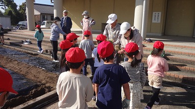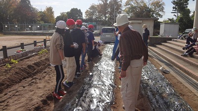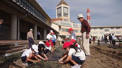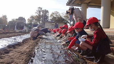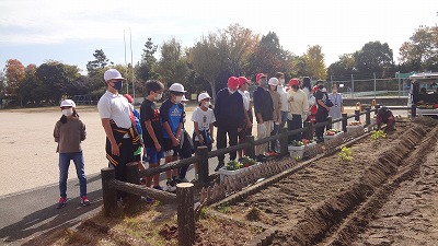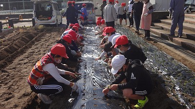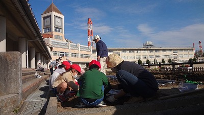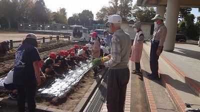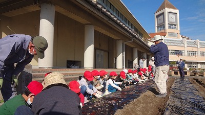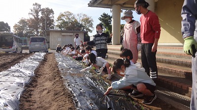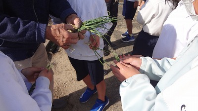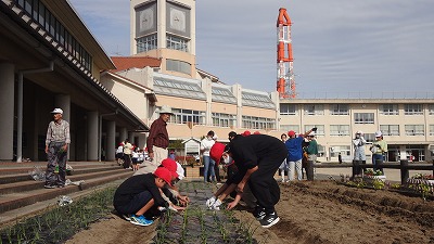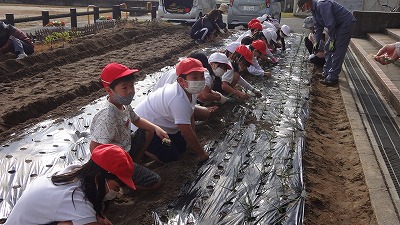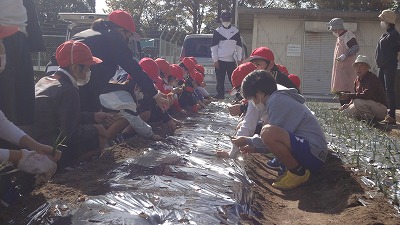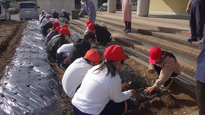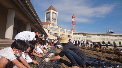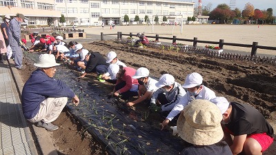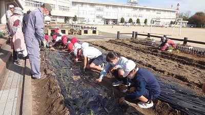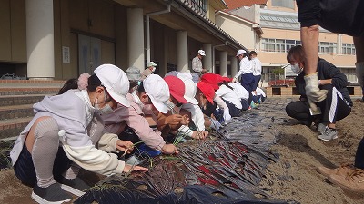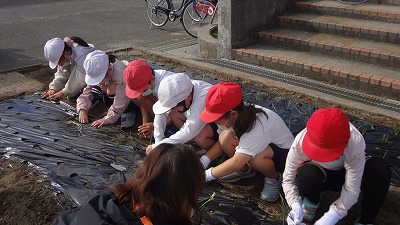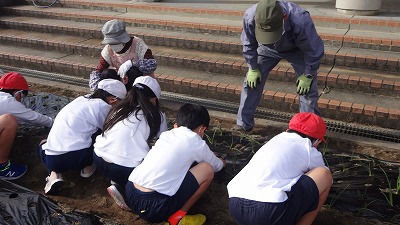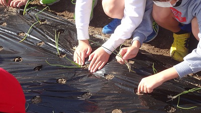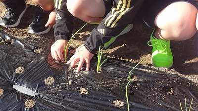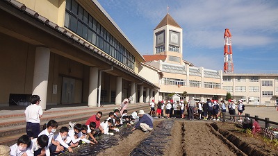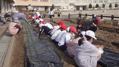 今日は、地域協力者の方々にお世話になり、全校で玉ねぎの苗植えをしました。学年によっては、苗の匂いを嗅いで、「あぁ~、いい匂い!玉ねぎのいい匂いがする!」「本当や、めっちゃ玉ねぎの匂いや!」等と言いながら、植えていました。