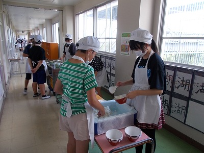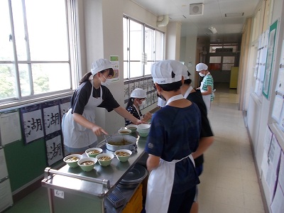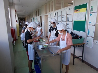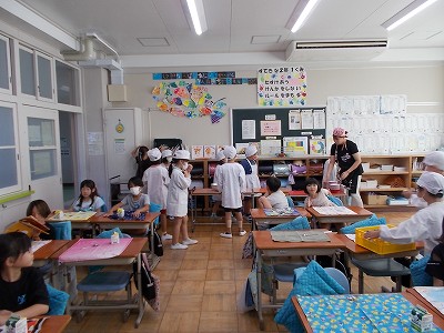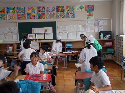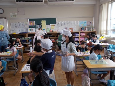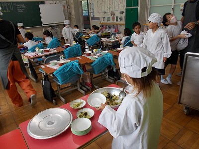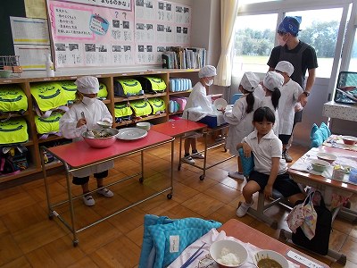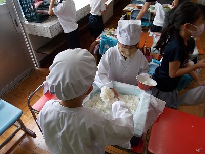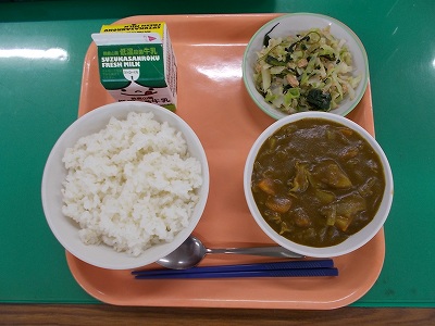 今日から給食が始まりました。初日はカレーです。各クラスを回ると、子どもたちが友達と協力して配膳する姿が見られました。たくさん食べて、大きくなあれ!