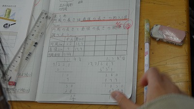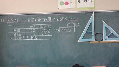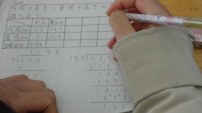 5年生の算数科では、円周の長さと直径の長さの関係を、実際の円を用いて計算で求める学習をしました。多少の誤差が出ますが、自分で計算して求めることが大切です。
