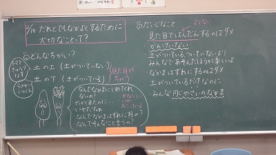 誰とでも仲良くするために大切なことはどのようなことかについて考えました。子どもたちからは、「見た目の違いで判断するのではだめ」「みんなで仲良くした方が楽しい」等の考えが出ました。自分事として考えることが大切ですね。