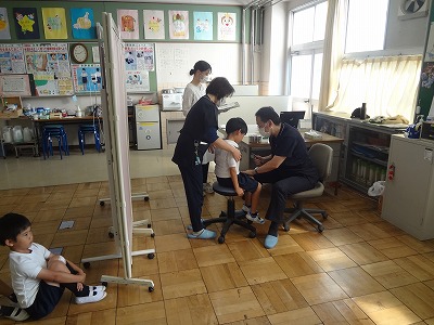今日は、学校医先生が来校れて持久走記録会前の健康診断がありました。診断前、静かに並ぶことができています。