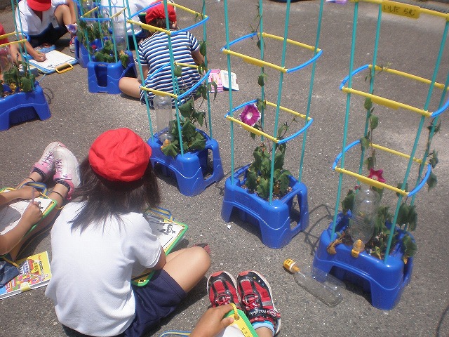 5月の連休明けに植えたあさがおの種。毎日の水やりのおかげで、ぐんぐんつるが伸び、りっぱなあさがおの花を咲かせはじめました。「むらさきがさいたよ。」「ぴんくがさいたよ。」と、まいにちうれしそうに報告してくれる1年生です。 |