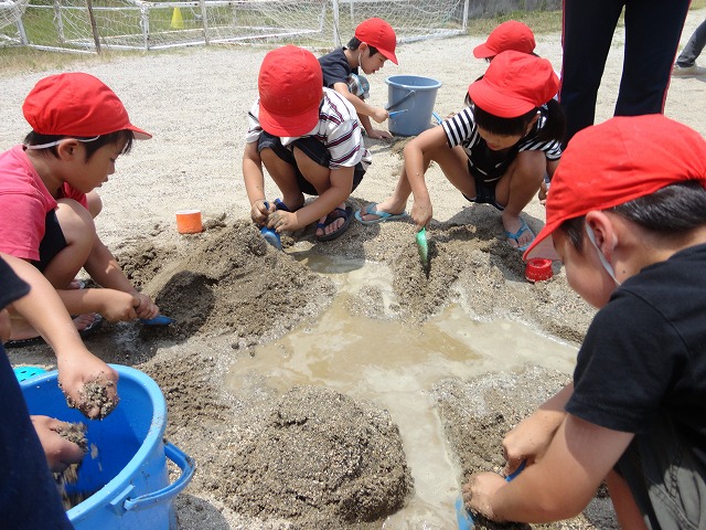 生活科で「わくわくなつさがし」をおこなっています。今日はみんなで、水を使ってのどろんこ遊び。砂山を作ったり、トンネルを作ったり、川を作ってつなげたり、最後にはみんな裸足になって泥だらけになりながら夏を感じていました。どろんこ遊びを楽しんだあとは、後片付けもしっかりすることができました。 |