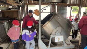 今回、西大鐘地区にある「かぐやがま」を見学させていただきました。「どんなところなんだろう」「早く行ってみたいな」と子どもたちはワクワクした様子でした。下野地区は、竹が多いので、それを利用して竹炭を作っています。竹炭をどのように作っているのかをお聞きしました。10時間もかけて作ると知り、子どもたちは驚いていました。