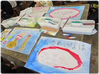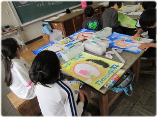 食べ物もいっぱい紹介してくれました。バナナに見た目は似ているけれど、揚げ物にしたりすりつぶしたりして食べるプランテン。お祝いの時の料理なども紹介がありました。中には、そのお料理を知っている子もおり、「本当においしいよ!」などなど、盛り上がりました。また、正装はやはり色とりどりの色彩の服装で、黒板に映し出されると「うわ!ゴージャス!」と子どもたちの声。