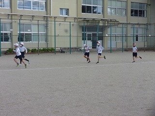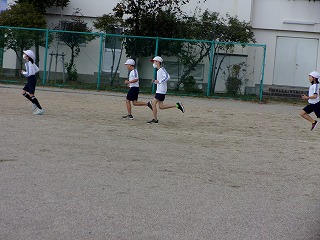 11月24日(水)2限目に、冬に体力を高めるための運動として、4年生が運動場で5分間走に取り組んでいました。3分経つと先生から合図があって、みんな最後まで走ろうと頑張っていました。