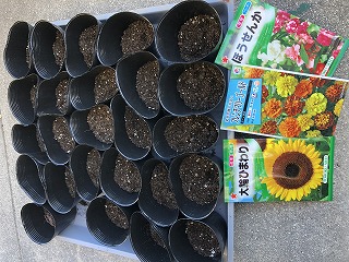 ホウセンカ、マリーゴールド、ひまわりのたねをまきました。