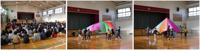 2月16日(金)に、四日市市文化会館で特別支援学級の学習発表会が行われます。その発表会に、なかよし学級の子どもたちが出演します。今年は、パラバルーンを使ったパフォーマンスです。本番のリハーサルということで、1年生などを招待してくれました。みんな、本番さながらの演技でした。みんなから、拍手をもらって、とても嬉しそうでした。
