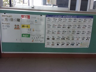 児童玄関前に、毎日給食委員が今日の献立を、みんなにお知らせしています。バランスよく栄養が取れる給食。今日もとてもおいしかったです。