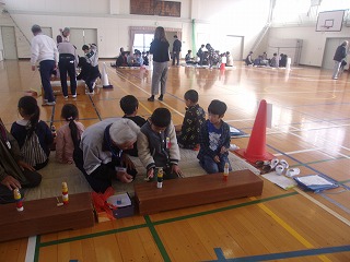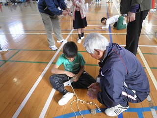 11月21日に、1年生の子ども達のために40人ほどの楽寿会の方々が来てくださいました。けん玉、竹ぽっくり、だるまおとし、メンコ、折り紙、お手玉、あやとり、おはじき、竹とんぼ、こまの10種類の昔ながらの遊びのコツを教えてくださるためです。どの遊びも練習を重ねて技を磨きながら楽しめるようになるものばかり。1年生の子どもたちにとって、初めて挑戦する遊びや、今までしたことはあってもうまくできない遊びがいくつもあります。見本を見せていただいたり、コツを聞かせていただいたりしながら、自分の腕を磨こうと、誰もが生き生きと活動できました。3学期はじめには、楽寿会の皆さんから教わったコツを思い出しながら、生活科の時間を使って練習していく予定です。