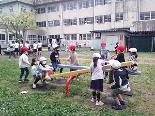 中庭のシーソーに乗っている子たちがいました。
