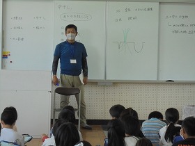 7月2日(木)に山城町の日沖さんに来ていただき,米作りに大切な「中干し」の作業について話していただきました。中干しとは,田の水をぬくことで,根に新しい空気をあたえること,土の中にあるガスをぬくことなどが必要であることを学ばせていただきました。