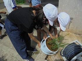 その後,学校で育てているバケツ稲も中干しを行いました。元気に稲が育つことを願い,観察を続けていきましょう。