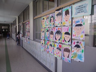 2年生が図工で自分の似顔絵を書いていました。どれも個性的な絵ですてきでした。