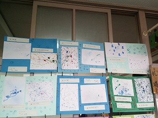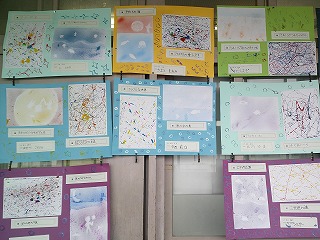 今、4年生の教室の前に図工で描いた絵がはってあります。一人ひとりどくとくな絵が描けていました。みんながこの絵を見て、自分もこのような絵を描きたいと思えたらいいと思います。