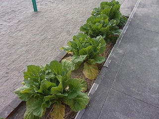 なかよしのクラスでは、白菜を育てています。種を植えた日は、9月の上旬ぐらいです。今は、写真のようにこんなに大きく育っています。これも毎日水をやって心をこめて育てていたおかげですね。植えてある場所は、なかよしクラスの前の花壇です。もうすぐ収穫の時期です。