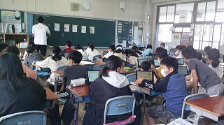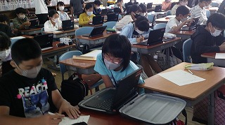 班ごとに分かれて、それぞれのテーマについて、タブレットパソコンを使って調べました。