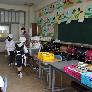給食の時間に、2年生の教室で給食の盛り付けをしていました。待っている人は静かに待っていました。これからも静かに待っていてほしいと思います。給食当番の人は、しっかりと仕事をしていて、素晴らしいと思いました。