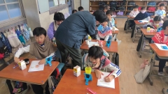 今日は、いつもお世話になっている学校歯科医の橋本先生と、歯科衛生士の妻木さんにお越しいただき、3年生に歯磨き指導をしていただきました。歯についてのお話を聞かせてもらったあと、染出しをして自分の磨き残しがどこにあるのかを確認しました。その後、歯磨きのポイントを教えていただきながら、実際に歯磨きをしていきました。磨きにくいところを意識しながら、みんなきれいに磨けていました。おうちでも今日教わったことを意識して、歯磨きできるといいですね。